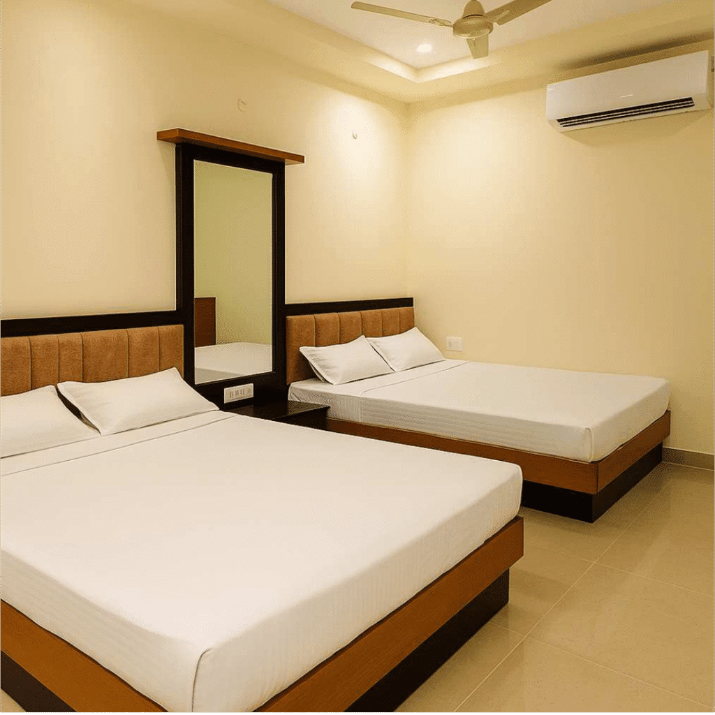 The Shared Room / Shared Beds facility at Sarangpur Trust Dharmashala offers a practical and affordable stay for devotees who prefer a community-style living experience. Ideal for short visits, group travelers, and solo yatris seeking a simple resting arrangement, this shared setup ensures a safe and welcoming atmosphere.